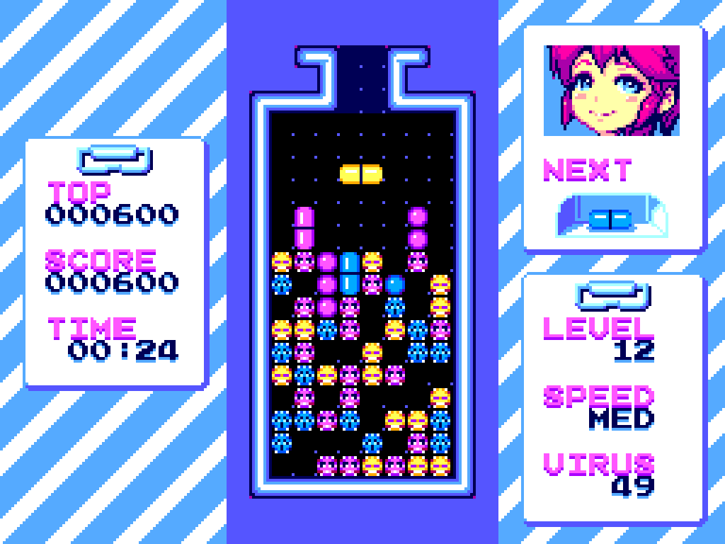 Для 16-битной приставки Sega Mega Drive / Genesis предлагается игра «Mai Nurse» от lunoka. Это головоломка в стиле «Dr. Mario». Помогите Май избавиться от вирусов с помощью таблеток, расположите 4 ячейки одного цвета по горизонтали или вертикали